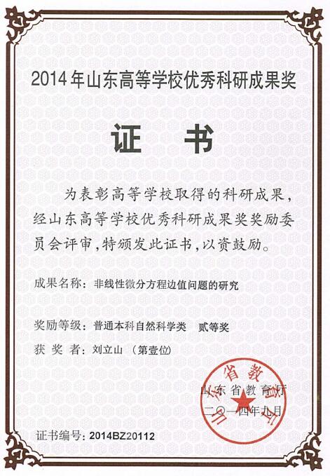 2014年9月刘立山获山东省高等学校优秀科研成果奖自然科学类二等奖