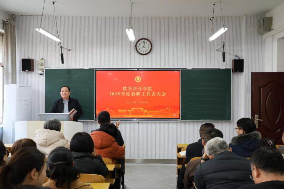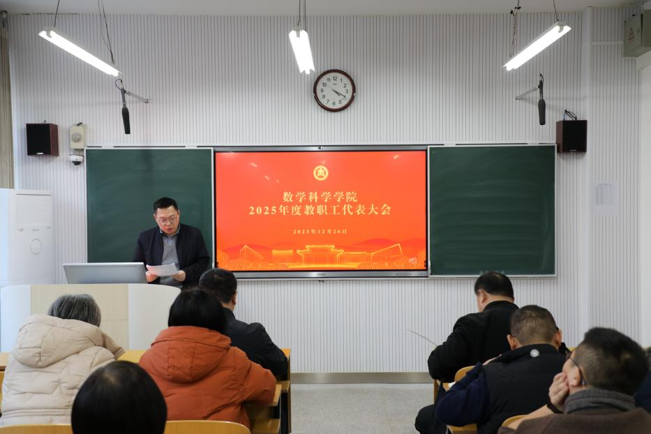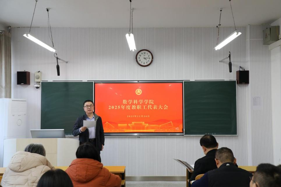 院长王培合作工作报告。他对学院在党的建设、人才培养、科学研究、社会服务和文化传承等方面都取得的成绩进行详细总结,对在教学、科研、人才培养等方面的短板和不足进行深入的分析。王培合指出目前学院正处于内涵发展的关键机遇期,机遇和压力并存,希望和挑战俱在。王培合对2026年度工作进行部署,他强调必须锚定战略目标,进一步深化教育教学改革,完善卓越人才培养体系;强化有组织科研,明晰研究特色与潜力,推动高水平成果产出;打造高水平师资队伍,优化创新发展生态;深化国际交流合作,全面提升学科国际声誉,为学校事业发展和国家基础学科建设注入强劲的数学力量。