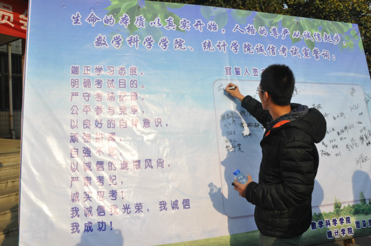 期末诚信考试倡议书》,刘贝同学带领全体同学进行宣誓:“面对考试,我们庄严宣誓:端正学习态度,明确考试目的,严守考场纪律,公平参与竞争,以良好的自律意识,顽强拼搏,自强不息,以诚信的道德风尚,严肃考纪,诚实应考,我诚信,我光荣,我诚信,我成功!”随后全体学生在诚信考试承诺宣传板上签字。最后王作茂老师对大会进行了总结,希望同学们真正能树道德之风,立诚信之本,当诚信考生,考真实成绩,做到期末考试违纪零容忍,并预祝同学们在期末考试中取得理想的成绩,在同学们热烈的掌声中,大会圆满结束。