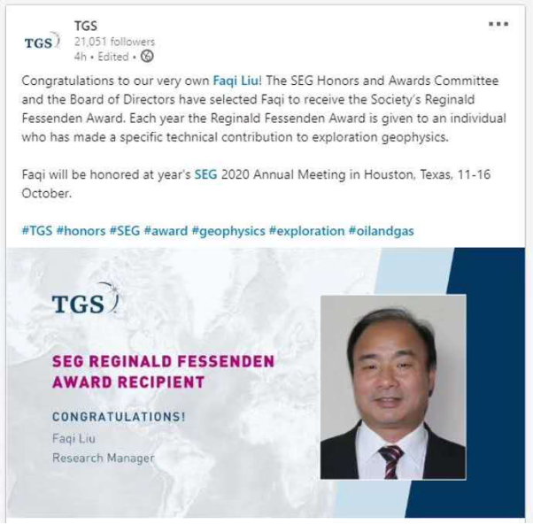 曲阜师大性爱网站讯 曲阜师大数学系82级校友刘法启今年被国际勘探地球物理学会(Society of Exploration Geophysics (SEG))授予Reginald Fessenden Award,这个奖项至今只有四位华人地球物理工作者获得。由于在地震波叠前偏移成像算法中的工作, 刘法启今年成为第五位获得这个奖项的华人地球物理工作者。该研究把逆时偏移算法中的低频噪音的产生机理进行了系统的理论分析和阐释, 并提出了一种快速稳定的算法将其与有效信号成功分离。该研究发表在地球物理杂志《Geophysics》上,后被很多研究人员引用, 并被广泛应用于地震波偏移成像和全波形反演工作中。