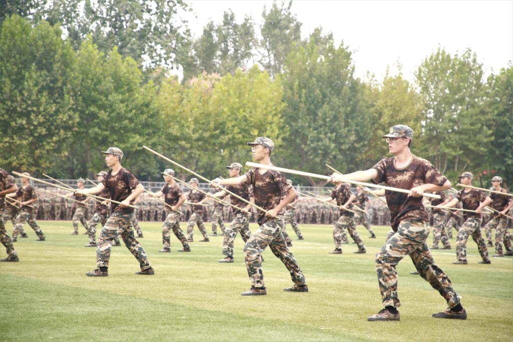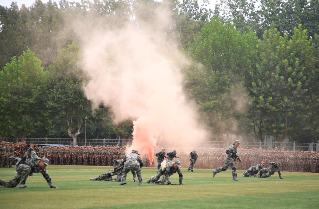 庄严肃穆的《义勇军进行曲》响起,拉开了本次军训汇演的帷幕。随后,一支支方队依次上场,齐步和跑步连队步伐一致,气宇轩昂;擒敌拳方队和棍术方队气势如虹,势如破竹;定向越野方队精力充沛,精准严密;旗语方队整齐划一,动作有序;内务连队和心理健康操连队训练有素,刚柔并济。标兵连配合着摆出“百年初心牢记使命”“请党放心强国有我”“苦练本领保家卫国“等字样,为建党100周年献礼。