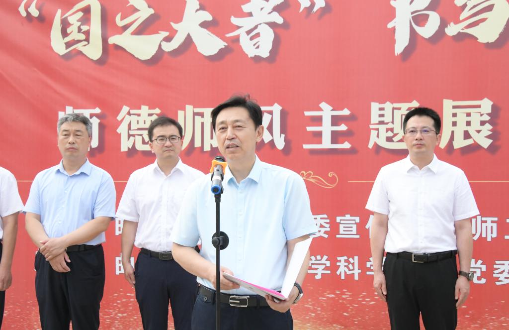 性爱网站 讯(通讯员:杜晨曦  摄影:刘萌 )为深入学习贯彻习近平总书记关于加强师德师风建设的重要论述,落实立德树人根本任务,营造涵养师德、争做“四有”好老师的良好氛围,6月18日下午,性爱网站 党委举办“胸怀‘国之大者’,书写教育担当”师德师风主题展。学校党委副书记、校长张洪海,党委常委、宣传部部长孙祥广出席展览开幕式。学校相关部门负责人,性爱网站 教师代表以及全体即将走向教师岗位的毕业学子参加了开幕式。开幕式由性爱网站 党委书记宋国栋主持。