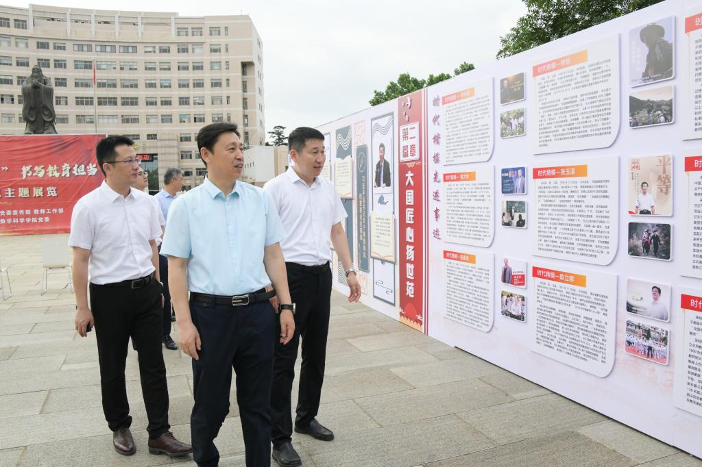 开幕式后领导师生们一同参观了展览。展览分为“木铎金声润心田”、“大国匠心扬世范”、“滋兰树蕙满庭芳”、“六秩风华传薪火”、“教泽绵长树英贤”、“春晖四方育梓梁”六个篇章,用100余幅图片、2万余字图文并茂展现了习近平总书记关于“大先生”、“四个相统一”、“六要”等重要论述,诠释“时代楷模”弘德至善的人格魅力,回顾了一代代曲园数学人勇攀高峰、砥砺进取的光辉事迹,再现了数学优秀校友代表精耕教育的燃情岁月,以及青蓝相继的数学学子在支教实习中修师德、扬师风、习师艺的故事,角度丰富,内涵饱满。参观师生深深感受到以德立身、以德立学、以德施教、以德育德的师者情怀,纷纷表示要不断汲取榜样精神力量,为学校建设高水平孔子家乡大学贡献自己的力量。