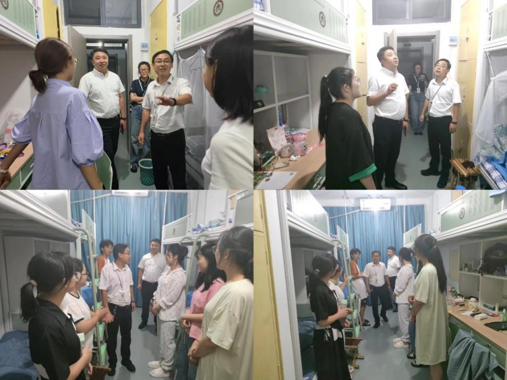 党委副书记曲凤东、团委书记徐腾飞与2023级辅导员刘翔进入学生公寓走访。