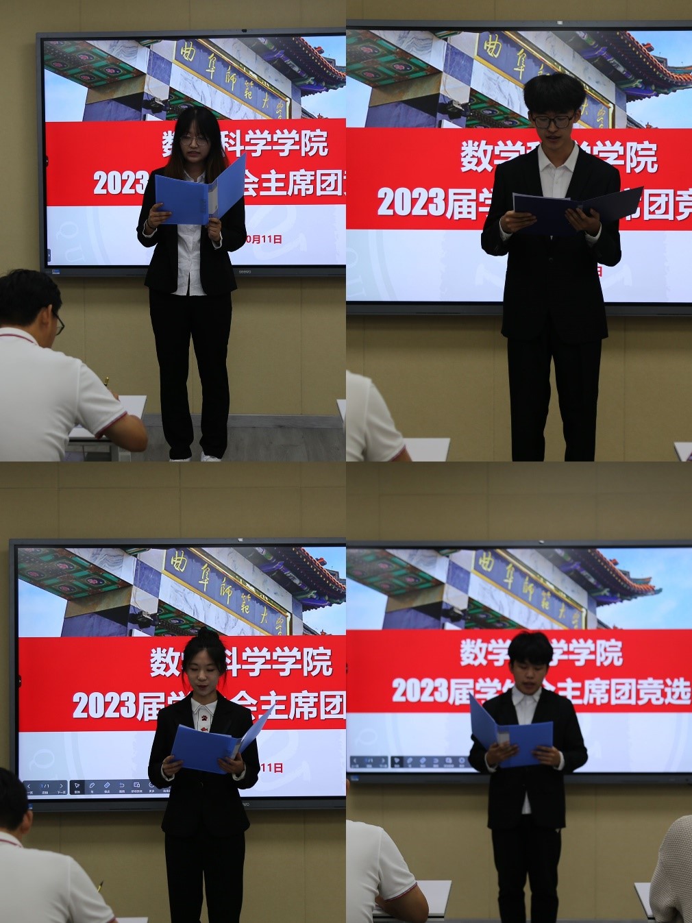 在系楼301教室举行2023届团委、学生会主席团竞选。学院党委副书记曲凤东、学院团委书记徐腾飞、各年级辅导员以及2022届主席团成员参与了本次换届竞选。