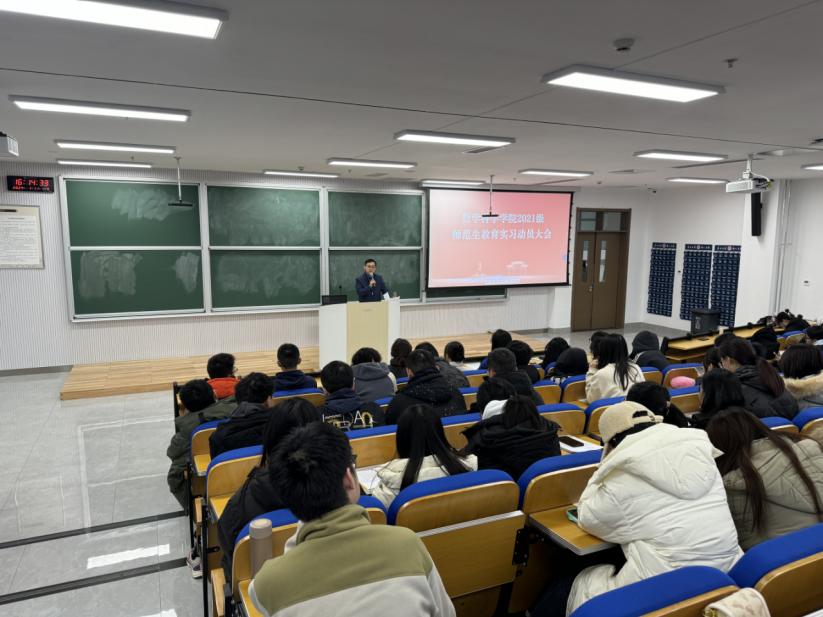 在致知楼101室召开2021级师范生教育实习动员大会。学院党委副书记曲凤东、实习指导教师代表许勇军、辅导员代表及2021级全体师范生参加动员大会。