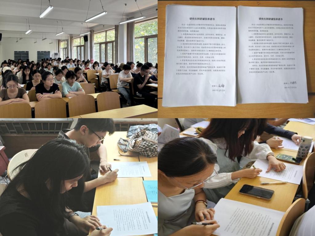 在交流讨论环节,同学们踊跃发言,围绕 “诚信与学术创新”“防范科研失信风险” 等议题,结合自身科研经历分享见解。2023 级硕士研究生袁同学表示,科研诚信是对科学精神的敬畏,学术研究中的每个数据、每处引用都应经得起推敲。讨论结束后,全体研究生郑重签署《科研诚信承诺书》,以书面形式明确责任,承诺自觉维护学术尊严。