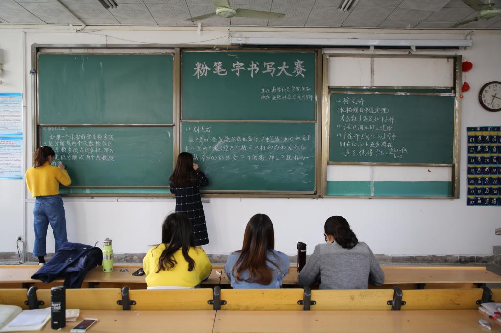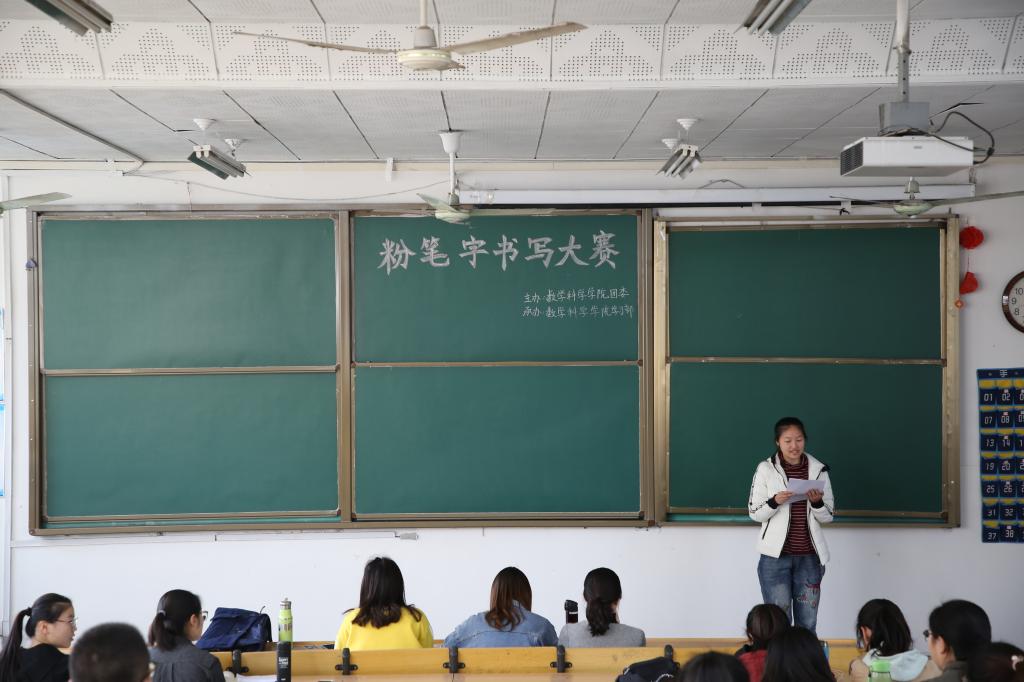 团委主办的“展书写技能,育教师风采”粉笔字书写大赛在数学楼顺利举行,该比赛响应了学院强化师范生“三字一话”素质训练的号召,是学院上下齐心协力推进师范生认证工作的重要一环。2017、2018级两个年级共35位同学参加了本次比赛。