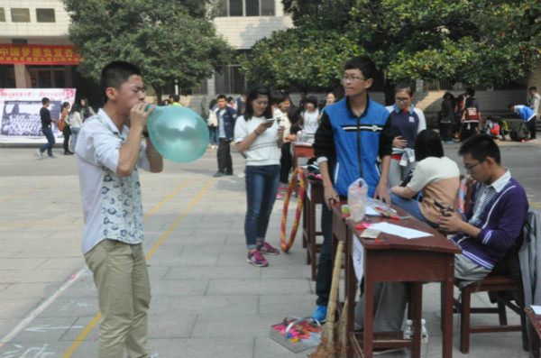 全体在校大学生展开。比赛囊括了齐心协力、投筷子、叠硬币、筷子夹玻璃球、自行车慢骑、单脚站立头顶书、跳绳、转书、顶扫把、背靠背挤气球跑、瞎子过桥等二十一个项目,种类繁多,考察的能力更是各种各样。活动现场,参加比赛的同学络绎不绝,更有一些校友旁观了比赛,欢声笑语不断,处处充满了青春与活力的活动现场,令他们想起了自己的学生时代,更勾起了他们对母校的深深眷恋。而参与了以考察团体合作默契为主的"齐心协力"项目的同学们纷纷表示通过这个游戏深切感受到了合作的重要性,并坦言在今后的生活和学习中定会更加注意合作,实现共赢,留给自己丰富、圆满的大学生活。