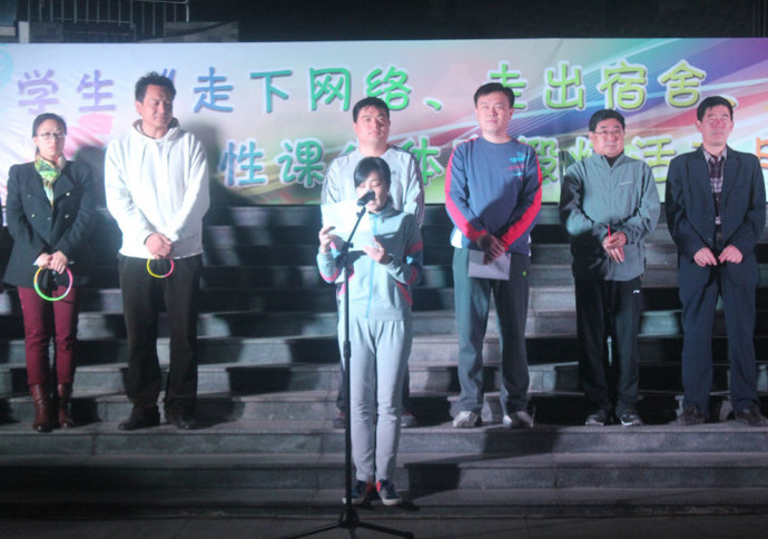 2014年10月30日晚,我校在大学生活动中心前举办“走下网络、走出宿舍、走向操场”主题群众性课外体育锻炼活动月启动仪式和环校彩虹跑活动。校党委副书记孙文亮教授,学生工作处处长杨永明老师,团委书记屈跃宽老师,保卫处副处长姜开勇老师,体育教研部副主任李大新老师,团委副书记张明洁老师出席本次会议。性爱网站