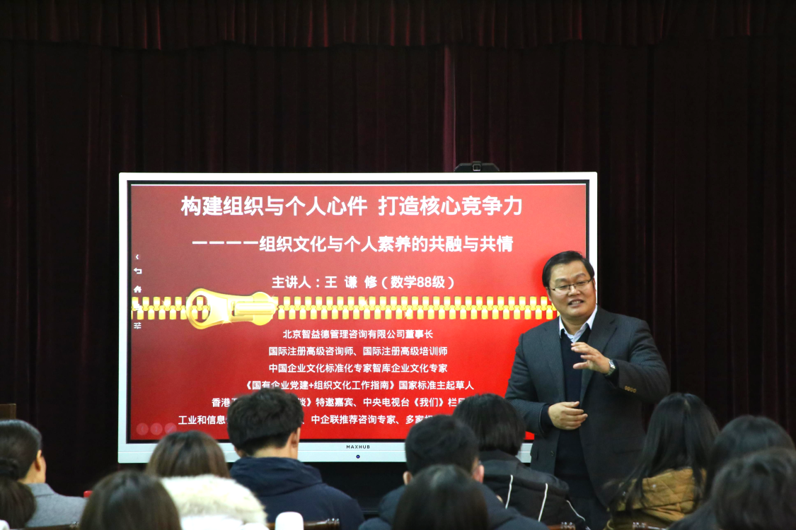 邀请88级校友、北京智益德管理咨询有限公司董事长王谦修作了题目为“构建组织与个人心件 打造核心竞争力——组织文化与个人素养的共融与共情”的报告。报告会由学院党委书记刘建新主持。学院全体学生干部参加会议。