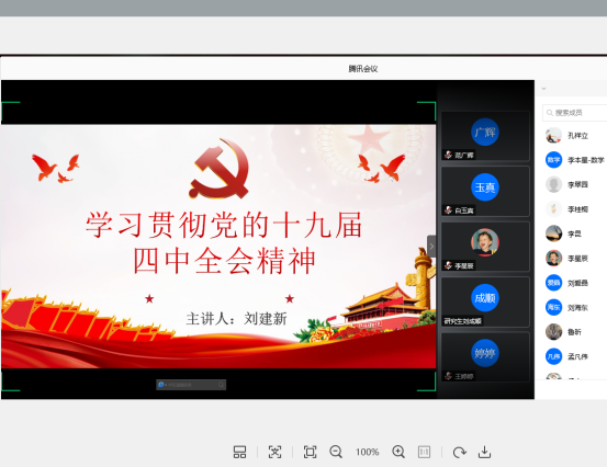 党委书记刘建新同志以“学习贯彻党的十九届四中全会精神”为主题通过腾讯会议开展线上讲党课活动,学院全体师生党员参加了党课。