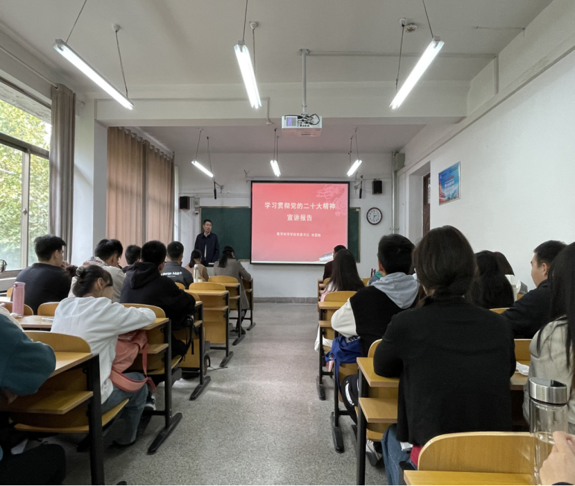 宋国栋在数学楼403教室为学院本科生和研究生部分学生代表宣讲党的二十大精神。