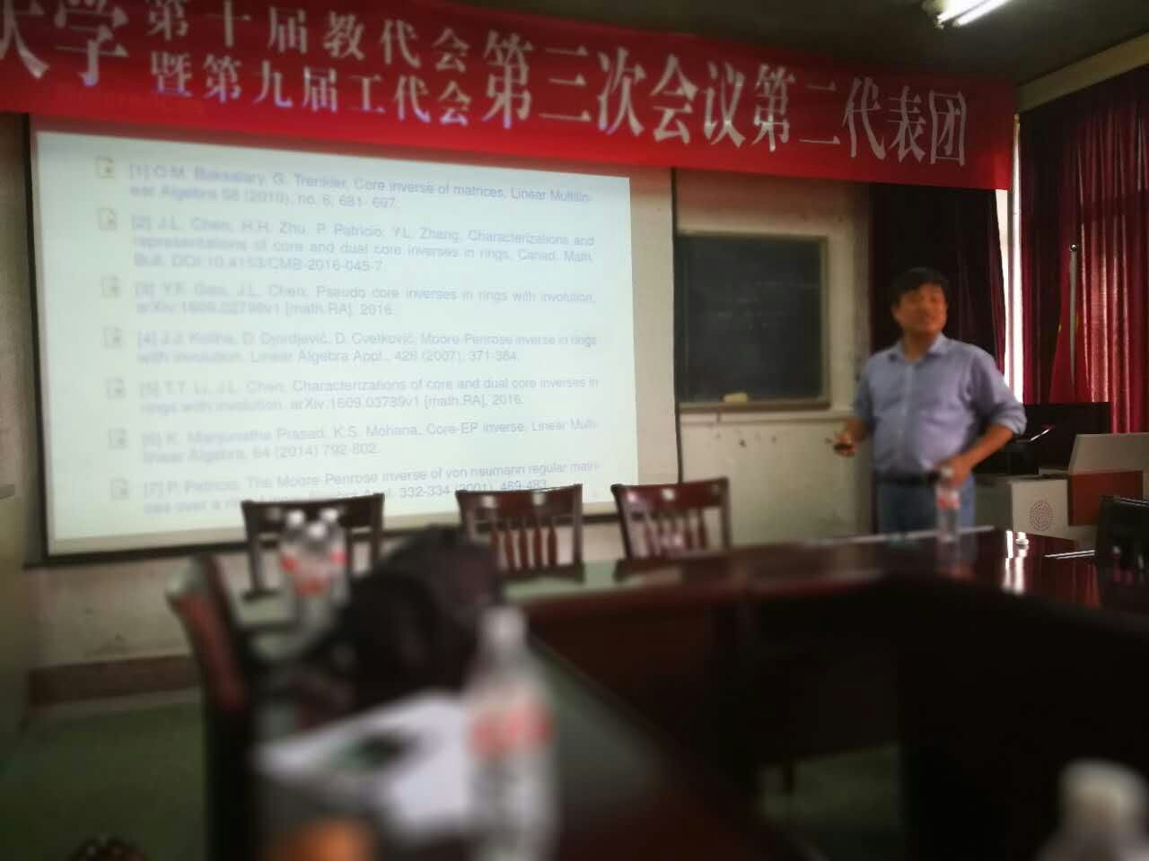 陈建龙,东南大学数学学院二级教授、博士生导师, 获中国科技大学硕士学位、哈尔滨工业大学博士学位,南京大学博士后,加州大学伯克利分校访问学者。江苏省“青蓝工程”、“333工程”、“六大人才”工程中青年学术带头人培养对象。曾担任教育部数学基础课程教学指导分委员会委员,东南大学数学系主任,中国数学会理事。现为江苏省数学会副理事长,享受政府特殊津贴。主要从事环论、模论、同调代数、矩阵论及广义逆理论等的研究,先后主持国家自然科学基金5项、教育部博士点基金2项和江苏省自然科学基金4项。已发表科研论文200多篇,其中SCI论文100多篇。获教育部高校青年教师奖,中国高校自然科学二等奖,江苏省科技进步三等奖2次,江苏省教学成果一、二等奖,国家精品课程负责人,国家精品资源共享课负责人,江苏省优秀教学团队负责人。出版“十一五”国家级规划教材2本,“十二五”国家级规划教材1本,出版英文专著1本。