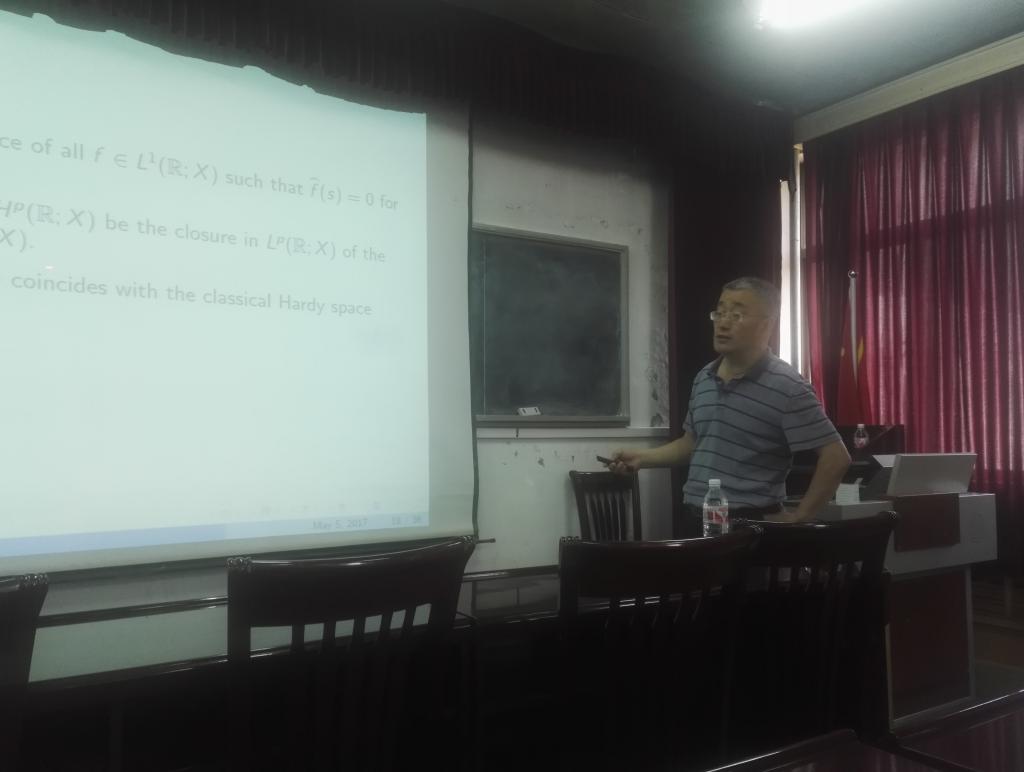 部分教师和研究生作了题为《Operator-valued Fourier multipliers on vector-valued Hardy spaces》的学术报告。 在报告中,步教授介绍了他在向量值Hardy空间上的Fourier乘子方面取得的一系列成果并给出一个具体应用。报告会后,步教授回答了与会师生提出的有关学术问题并进行了交流。