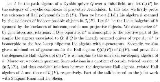 报告题目:Lie algebras and Hall algebras associated to 1-cyclic perfect complexes